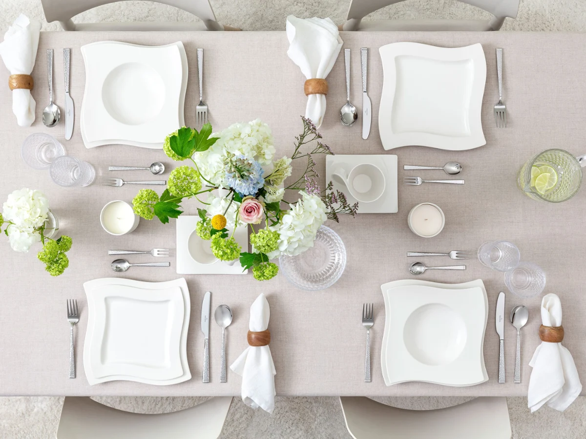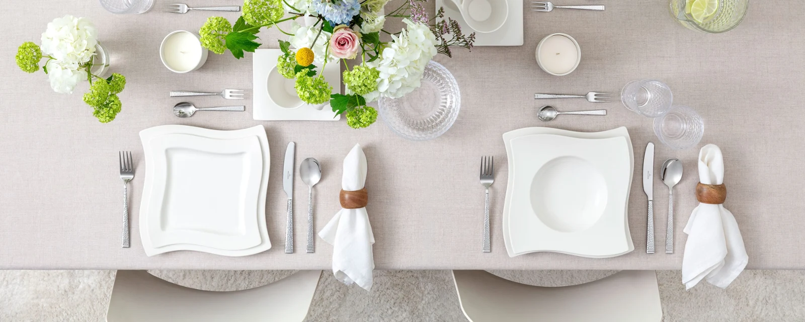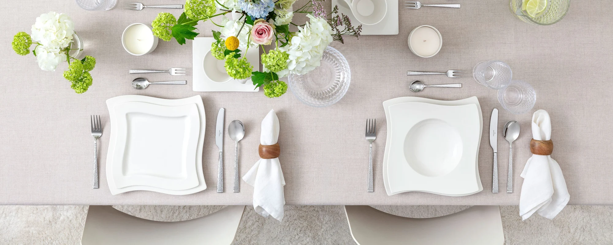 Draufsicht auf ein minimalistisches Tischgedeck mit NewWave Porzellantellern, Kaffeetasse und Untertasse, Boston- und Boston-Green-Gläsern sowie NewWave- und Blacksmith-Besteck. Blumenvasen setzen einen natürlichen und eleganten Akzent in der klaren Komposition.